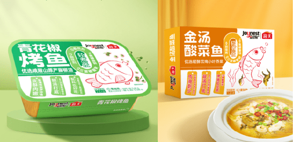 目前推出的两款皆为鱼制品,以8小时慢熬猪骨汤打底:青花椒烤鱼选用罗非鱼、藤椒油、青花椒和泡小米辣椒,带来多重辣爽,龙口粉丝、玉米为配菜,椒麻嫩爽,折后价675g/盒/84.96元;金汤酸菜鱼优选轻酵云南小叶芥菜和黑鱼柳精华部位,肉滑刺少,解冻后加热、煮沸35秒即可享用,折后价460g/盒/59.94元。