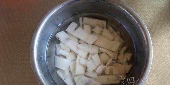 2莲藕切片,泡2遍水,浸泡在盆中备用
