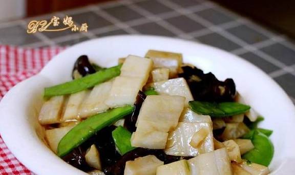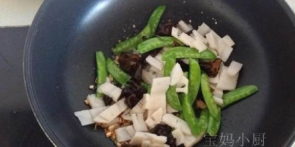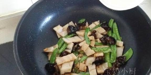 6放入控干水份的莲藕片、荷兰豆、木耳,翻炒均匀