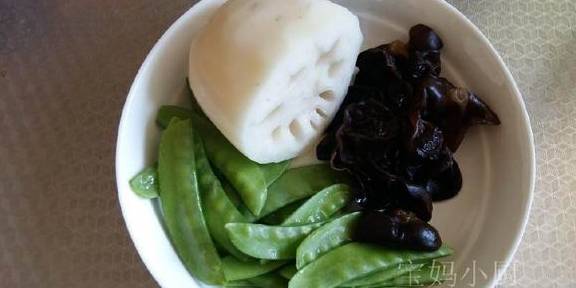 1备好食材。荷兰豆去筋洗净,木耳提前泡发洗净,莲藕去皮洗净