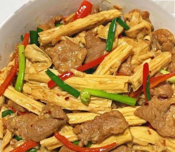 (3) 锅烧油放入瘦肉炒至变色断生加蒜末,再加入腐竹一起翻炒;