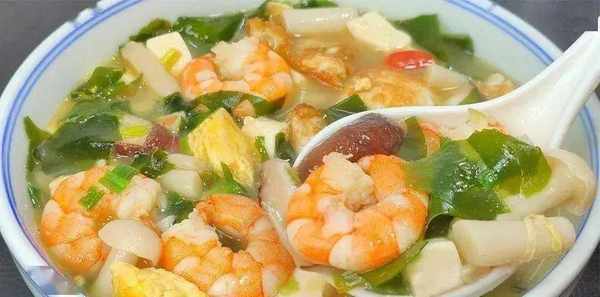 2、小碗里打入四颗鸡蛋,锅里油热,倒入鸡蛋,煎到两面金黄倒出来剁成小块,接下放入葱蒜爆香,放入虾仁、香菇、鸡蛋、海鲜菇,快速的翻炒均匀,把食材炒香,再倒入开水,盖上盖子,开大火煮三分钟。煮至汤汁非常的浓白,再倒入豆腐和裙带菜,煮上两分钟。调味,加入一勺鸡精,食盐,胡椒粉,搅拌均匀,撒上一把枸杞、葱花点缀一下,一道简单营养又好喝的裙带菜鸡蛋虾仁汤就做好了。