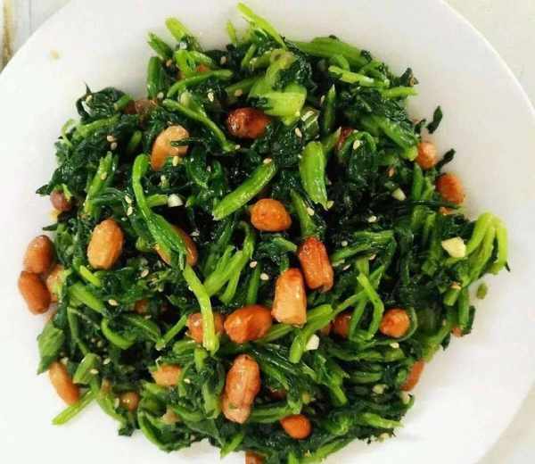 4.将菠菜切成段,放入大盆中,加入一勺盐、糖、陈醋和蒜末,再加花生,拌匀即可。