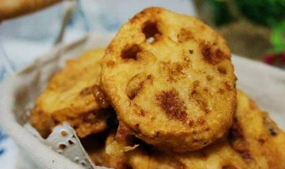 3,关于炸藕合:藕两节,去皮洗净备用,肉馅放在容器里备用,香葱切末也放在容器里,鲜姜切末也放进去,搅拌均匀,然后放五香粉,盐,鸡精,继续搅拌均匀,放料酒,生抽,蚝油,香油,搅拌均匀,藕中间不切断,切成藕夹,切好的藕夹备用,把切好的藕夹填进去肉馅,合住肉馅,这是夹好肉馅的藕夹,面粉,淀粉,五香粉(2克),鸡精2克,和盐5克和面粉放在一起,放水和面,请注意,这一步非常关键,想要藕夹上挂多厚的面,就看筷子头,把筷子头挑上来,看到了吗?如图所示,筷子头上能挂多少,藕夹上也就能挂多少,如果想要藕夹炸出来面粉薄薄的一层,就放水多一点,如果想要藕夹挂的面粉厚厚的,就少放一些水,面糊做好以后,把夹好的藕夹放进去,翻一下,裹匀面糊,锅内放油烧热,下锅了,待到藕夹变成黄色,这样的就可以出锅了。