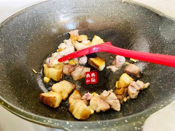 锅里不放油,把猪肉倒进去翻炒至出油,姜蒜放进去,炒于猪肉出香味,加生抽,蚝油炒均匀。