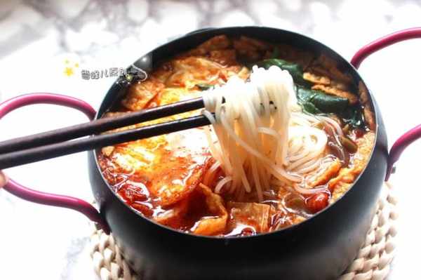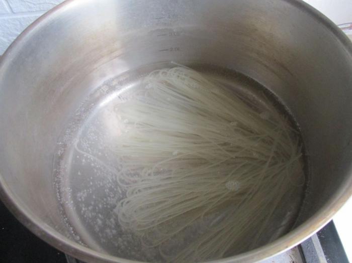 4、另起一個小鍋,放入適量的水,加上調味料煮開,把煮好的米粉撈出,控幹直接放入湯裏。
