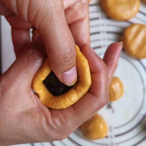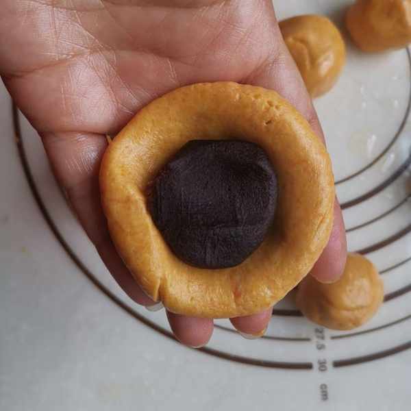 第五步:拿一個小劑子按扁,放入豆沙餡。豆沙餡可以是自己做的,自己做可以掌控糖分的多少,也可以是買的,買的就會比較甜,餡料的多少可以隨意。