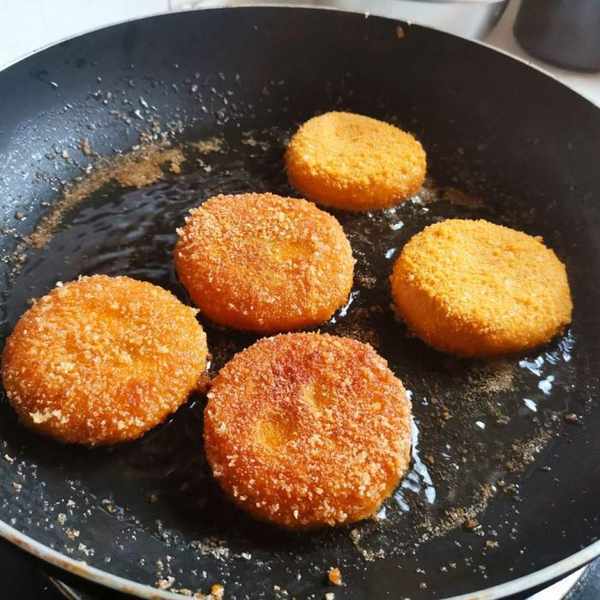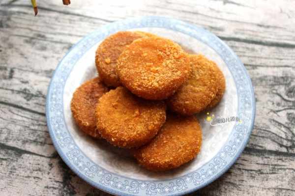 第七步:鍋裏放入少許花生油,把做好的小餅沾上蛋液和麵包糠,放入小火慢慢的煎制兩面金黃。