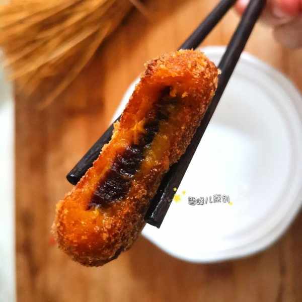 所用資料:南瓜1塊,糯米粉適量,豆沙餡少許,雞蛋1個,麵包糠少許,花生油2勺。