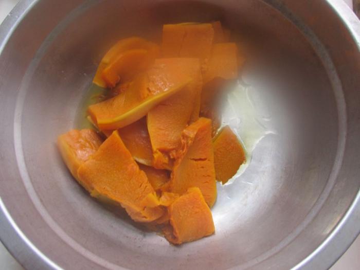 第一步:黃皮南瓜去皮去籽切片,上鍋蒸熟拿出放凉。其實南瓜的營養成分很豐富,含有維他命以及礦物質,常吃對於孩子的生長發育很有益處。而南瓜內含有的果膠有很好的吸附性,能粘結和消除體內細菌毒素和其他有害物質。秋天到了,南瓜上市,也是應季蔬菜,平時可以多給家人吃。