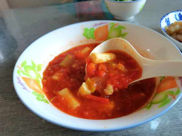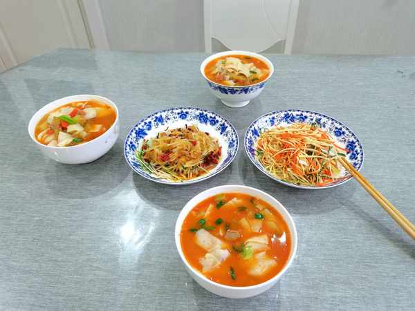 西红柿牛肉揪面,辣油冬瓜,豆腐皮拌红萝卜丝。