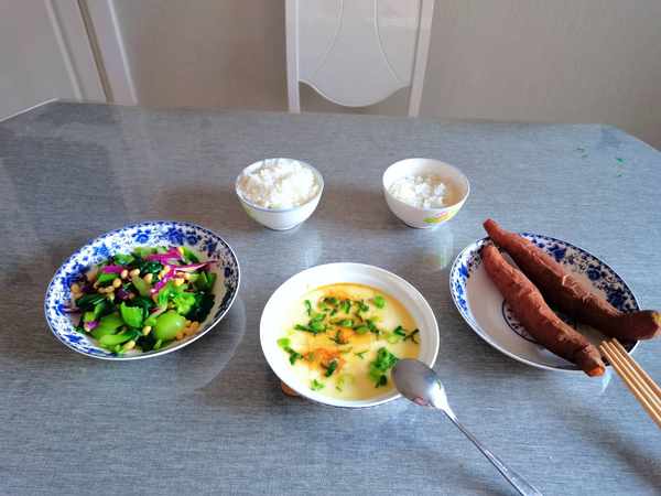 烤红薯,蒸鸡蛋羹,黄豆拌油菜,米饭。