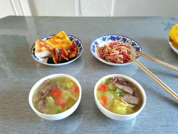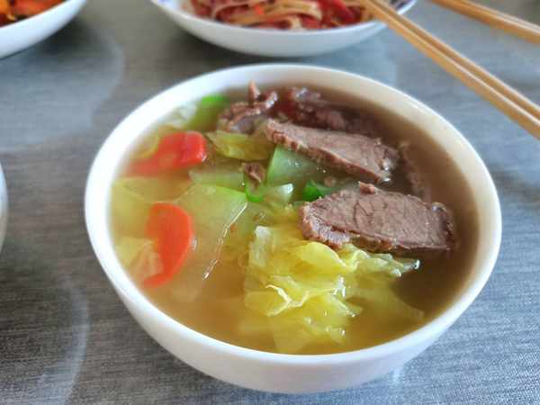 牛肉汤里面放上牛肉片,冬瓜片,大白菜片,红萝卜片,把冬瓜片炖透明,淋上香油出锅。牛肉汤里面有各种调料,所以不用放任何调料,菜香肉汤鲜美,营养美味。
