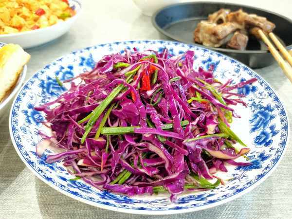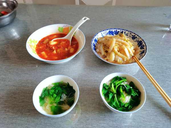 醋溜白菜,西红柿酱炖铁棍山药,煮龙须面。