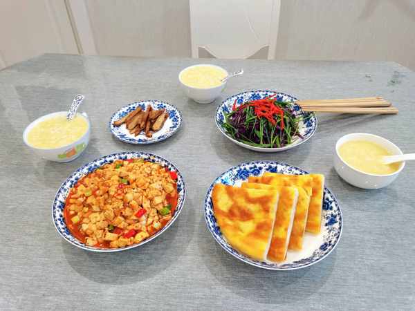 发面烙饼,麻婆嫩豆腐,大米小米稀饭,蒜苗紫甘蓝,五香豆干。
