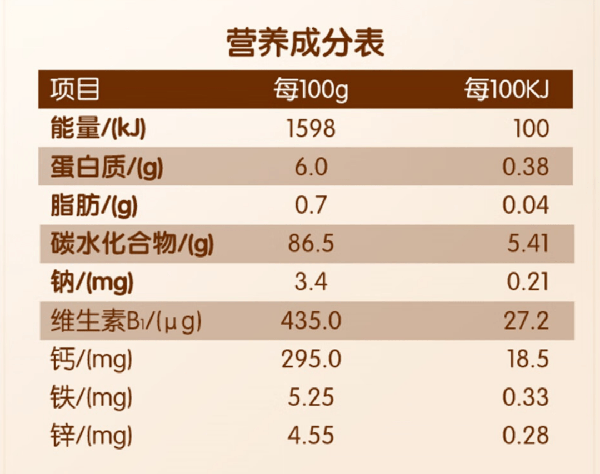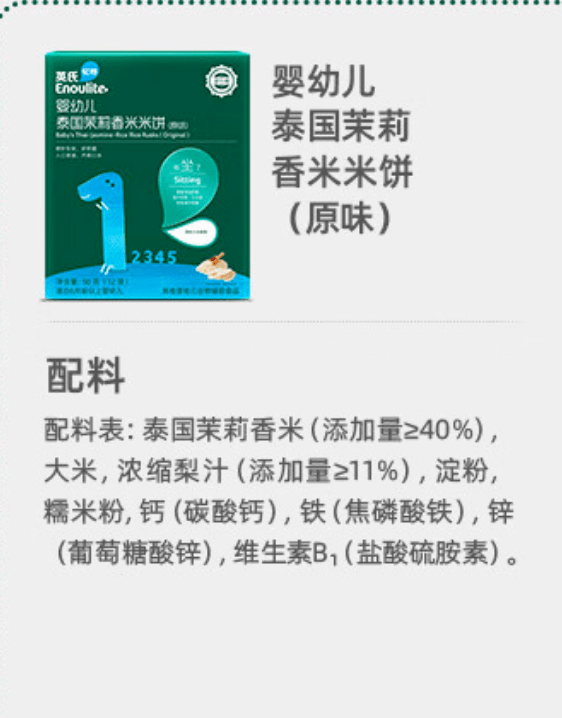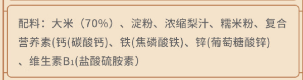配料为大米(70%) 、淀粉、浓缩梨汁、糯米粉、复合营养素(钙(碳酸钙)、铁(焦磷酸铁)、锌(葡萄糖酸锌)以及维生素B1(盐酸硫胺素)。