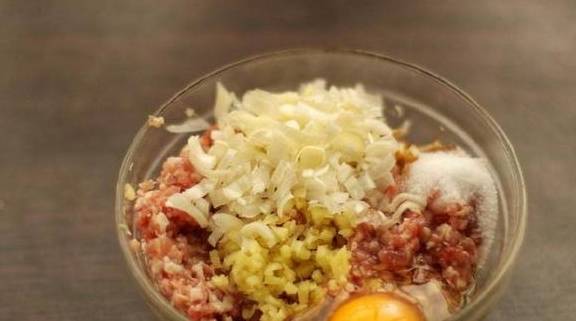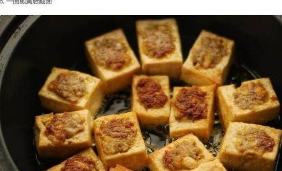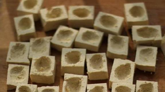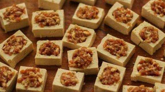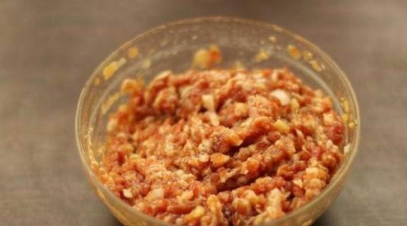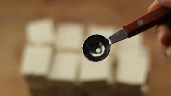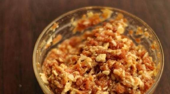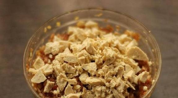 11.挖出来的豆腐不要浪费,稍微碾碎些加入肉馅中
