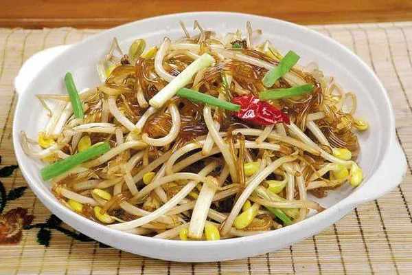 小豆芽150克、干粉条约200克、胡萝卜1小根、生姜1块、葱1段、蒜头2瓣、花椒1小撮、黑胡椒面1勺、生抽少许、香醋1茶匙、食盐适量、味精少量、宴友食用油适量