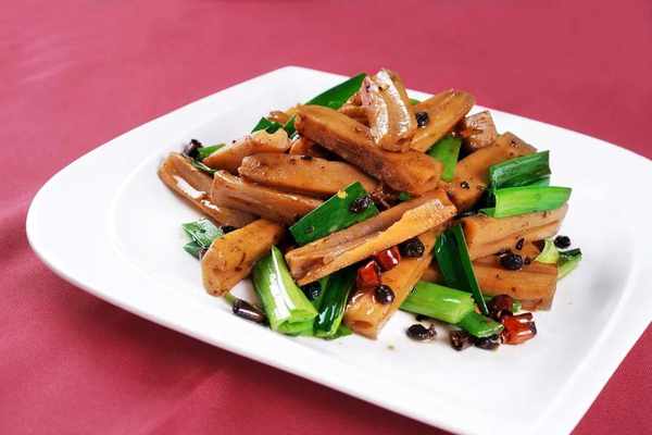 7 炒香后加入藕一起炒,加少量鸡精,就可以出锅装盘了。