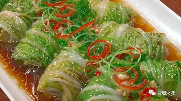 4.锅中加入少量的水,放上蒸笼,将弄好的白菜卷一个个地摆放在上面,然后盖上盖子蒸煮个10~15分钟。蒸熟后盛出里面多余的汤汁给它倒掉,然后放在一旁把葱丝跟辣椒是放在上面,加入少量的酱油。锅中烧热加入油,把油烧热,直接用热油淋在上面,这样子一份百财聚来就完成。