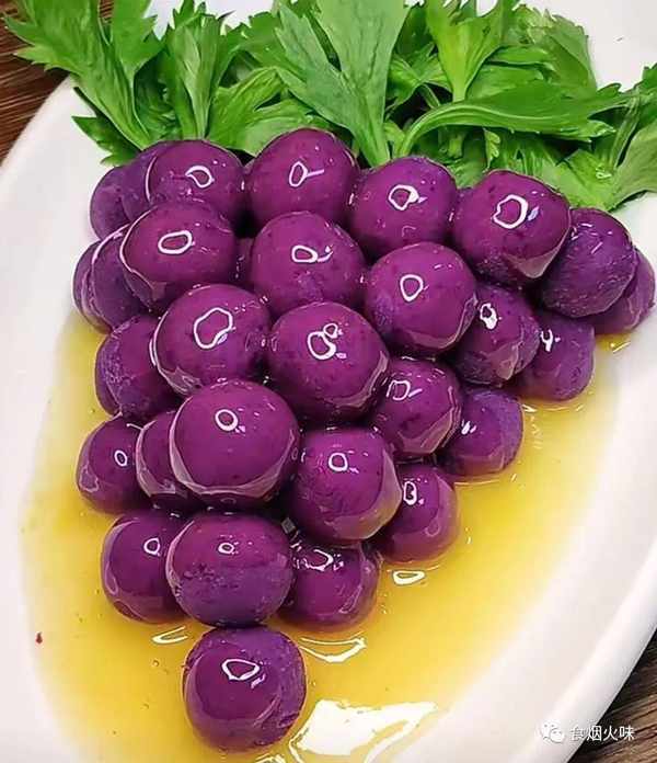 3.用勺子取出少量的紫薯放在手心,把它搓成圆球状,像一个小丸子。搓好的紫薯摆放在盆里面,我们给它摆成一个葡萄的形状,这样子一串串的颜色特别好看;