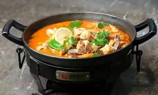将冬阴功汤放入锅中,加入六十块、虾和田鸡块煮5分钟,加盐调味,加入柠檬叶和新鲜柠檬叶煮片刻后盛入容器中。炭火烧底,撒上芹菜叶即成。