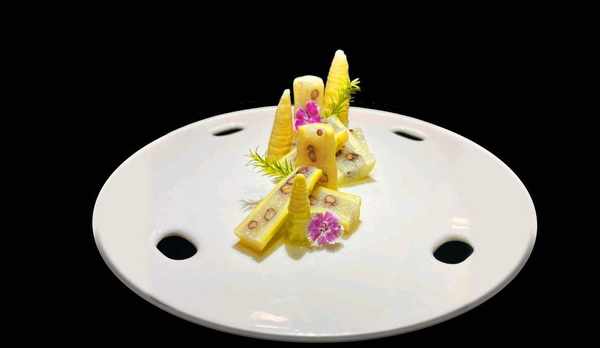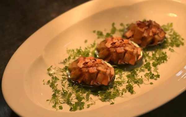 将煮熟的药明捞出放在药明壳上,最后在盘子里撒上炸好的葱花。