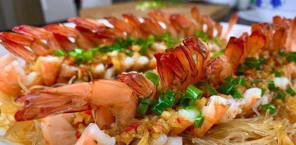 3、泡好的粉丝装盘,淋上酱油拌匀。然后将虾片放在上面,虾肉朝上,堆放整齐,上面均匀地抹上做好的蒜蓉酱。锅内水烧开后,放入蒸锅,盖上锅盖,大火蒸三分钟。取出蒸熟的大虾,撒上葱花和红辣椒碎,再倒入蒸好的鱼露,再倒入热油爆香。蒜蓉粉丝蒸虾就做好了。