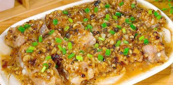 3、芋头垫底,切成厚片,装盘。然后把排骨放在上面,把黑豆蒜蓉酱全部抹在上面,然后放入蒸锅。开水,大火蒸半小时。蒸好后撒上葱花,蒜蓉豉汁蒸排骨就做好了。4.蒸芋头肉饼