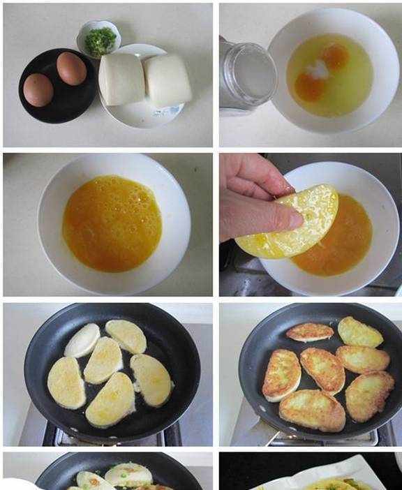 小贴士:1.馒头片要切得厚薄一致;2.裹蛋液的速度要快,避免馒头片吸收过多的蛋液而不煎得不酥脆;3.出锅前放入葱花煎一下,味道更香。
