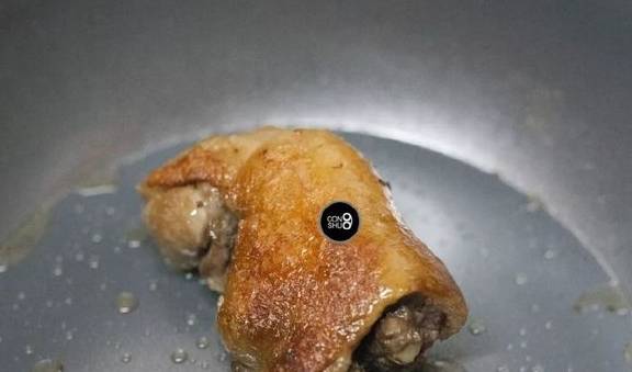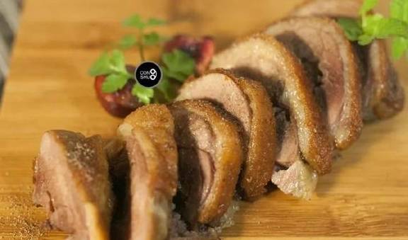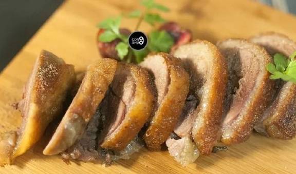 拆去棉线。锅内不加一滴油,中火,将鸭皮煎至表面金黄酥脆。(锅内的油都是鸭皮下渗出来的)尝过粤菜著名的脆皮烧肉么?做到这里,我觉得你会为自己尖叫的。