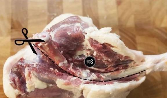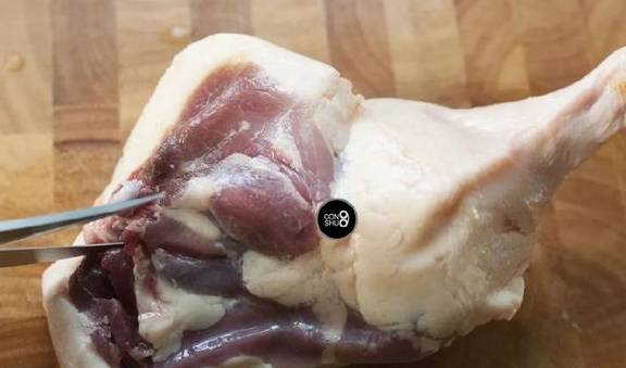 鸭腿……350g鸭腿从尾部(如图)沿骨头的走向剪开,去骨。去骨的主要原因是,最后是通过油煎的方式让表皮变脆,需要鸭皮能均匀并充分贴合锅子。有骨头的话很难做到这一点。(当然可以大口吃肉,不吐骨头也是葱姐最大的夙愿。)