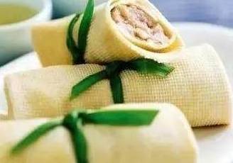3.将肉馅放在一角,向前卷起,再把两边向中心折叠,封住二头,最后卷到头。