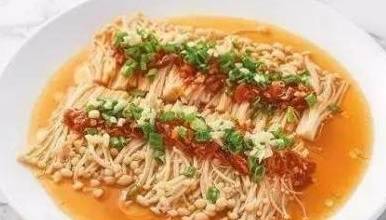 原料:金针菇300克、剁椒酱40克、盐1/2小勺、鸡精1/2小勺、胡椒粉1/4小勺、辣椒油20克、醋15克