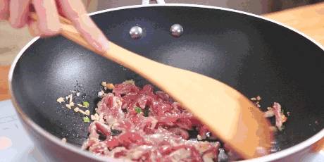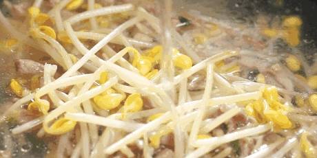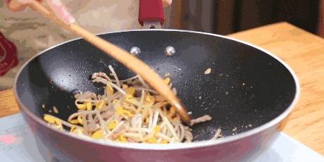 2.将葱、姜、蒜末倒入热好油的锅中小火爆香后,倒入里脊肉大火炒至变色,接着再倒入黄豆芽大火炒至变软