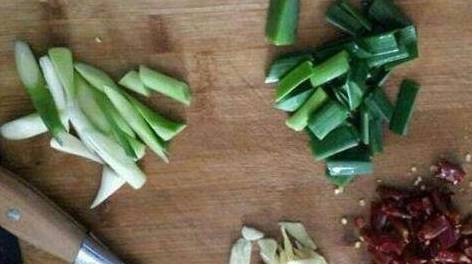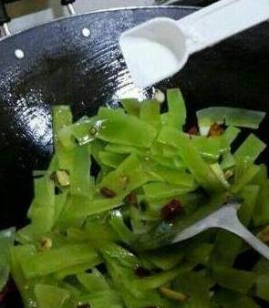 接下来就是将莴笋用清除冲洗,将盐给洗掉,放一边滤水备用。下面就要开始炒啦!锅中入油,依次将大蒜、辣椒放入爆香。稍微炒几下就可以了,不然辣椒容易糊掉,这时候赶紧倒入莴笋。