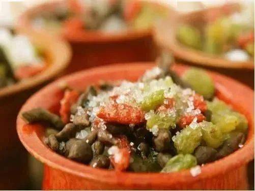 蕨麻米饭是将大米、蕨麻煮熟,各一半盛在碗内,再撒上白糖,浇上酥油汁。食用时用调羹边搅边吃,甜而不涩、油而不腻。
