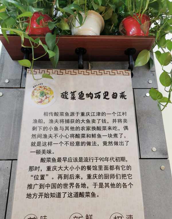 第一次看到解释酸菜鱼的出世记,有点意思。卖鱼的把剩下的小鱼换卖酸菜的酸菜吃。后来,既有酸菜,还有鱼,炖在一起蛮好吃,于是,推而广之。90年代火了起来。餐厅宣传画上的原话是:推广到了中国的世界各地。