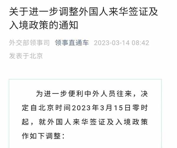 外交部领事司也在官微上发布了关于进一步调整外国人来华签证及入境政策的通知: