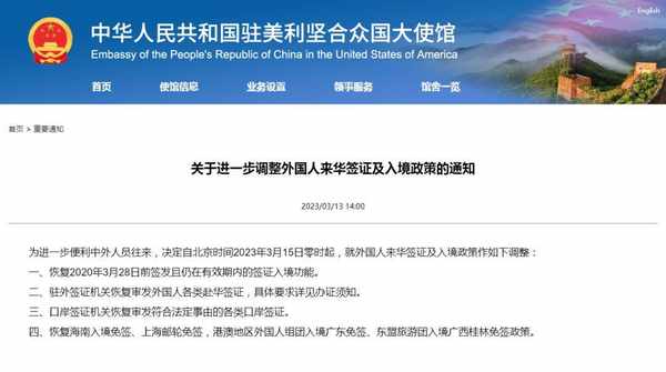 中国驻美大使馆发布最新通知,从3月15日起,将恢复外国人赴华的10年多次往返签证!具体调整内容如下: