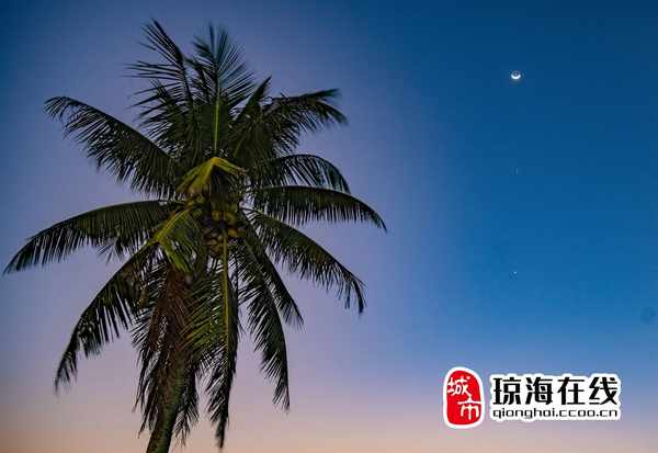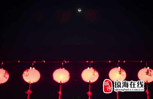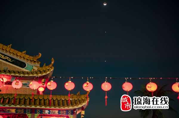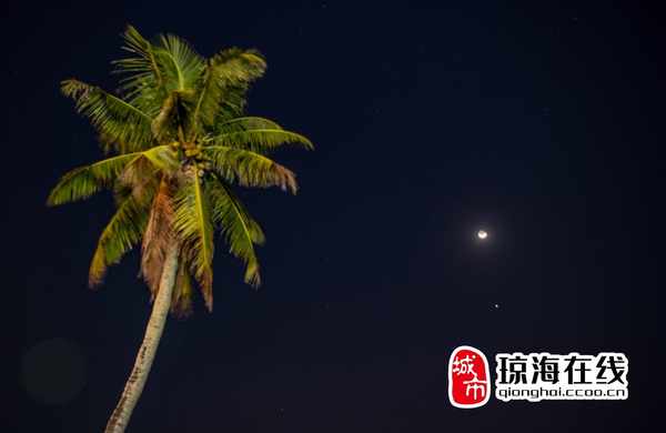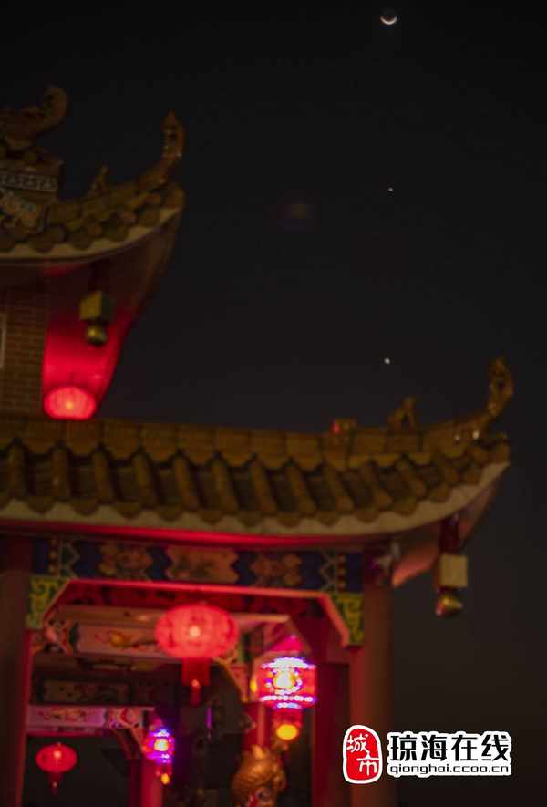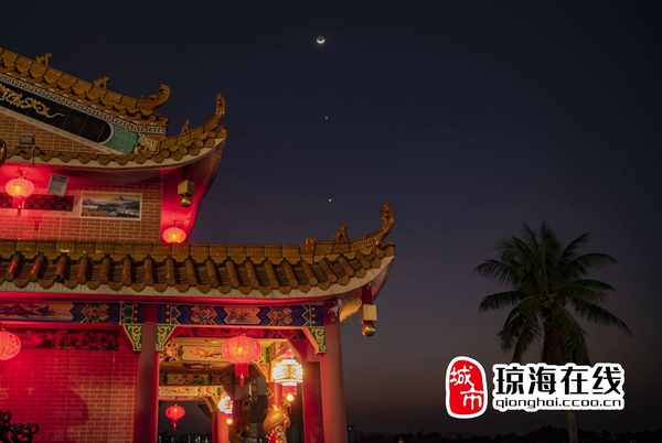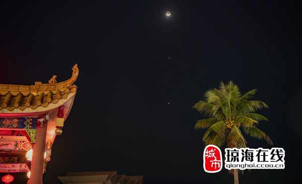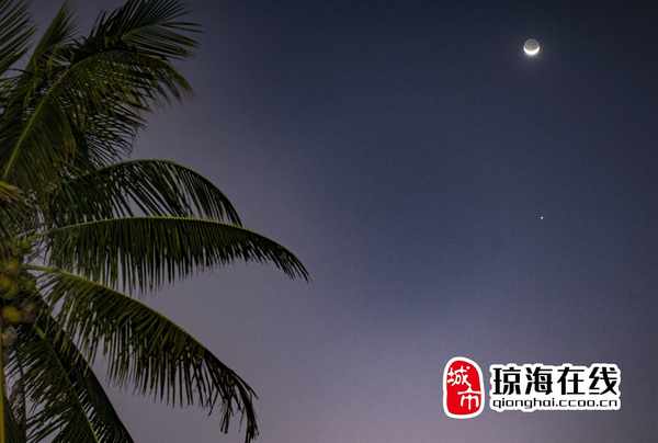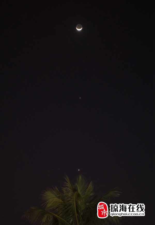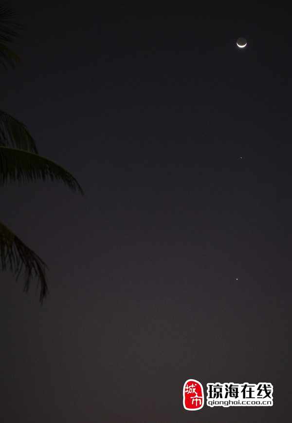 2月23日,琼海嘉积,万泉河上空现“三星连珠”天象。继“双星伴月”现身之后,海南琼海市上空再现“三星连珠”天象。当晚随着夕阳西下,金星、木星和弯月由西向东依次几乎等距离排成近似一条直线,呈现“三星连珠”稀奇景象。
