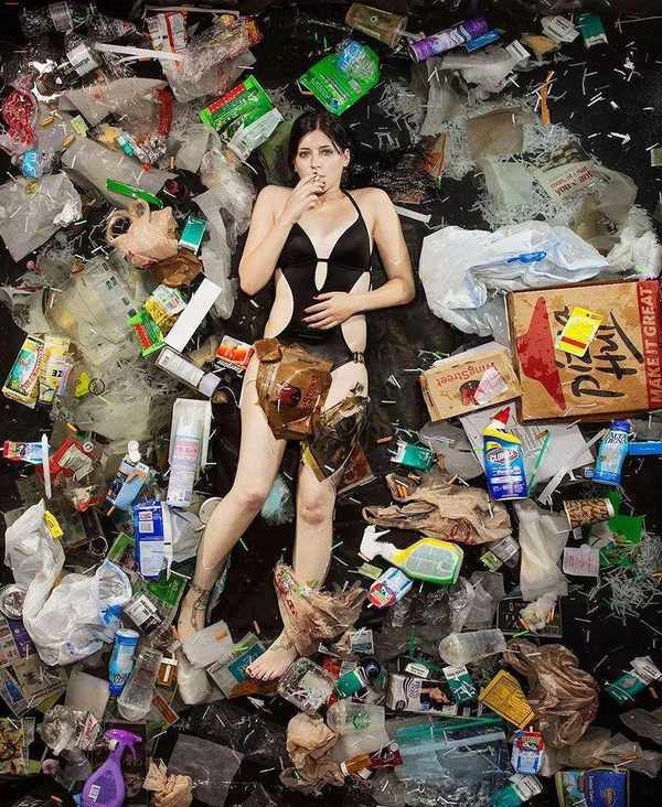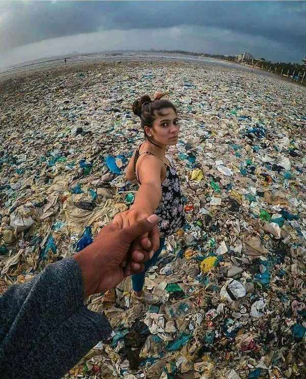 印度演员在垃圾河流里拍照,想唤醒人们对环保的重视。
