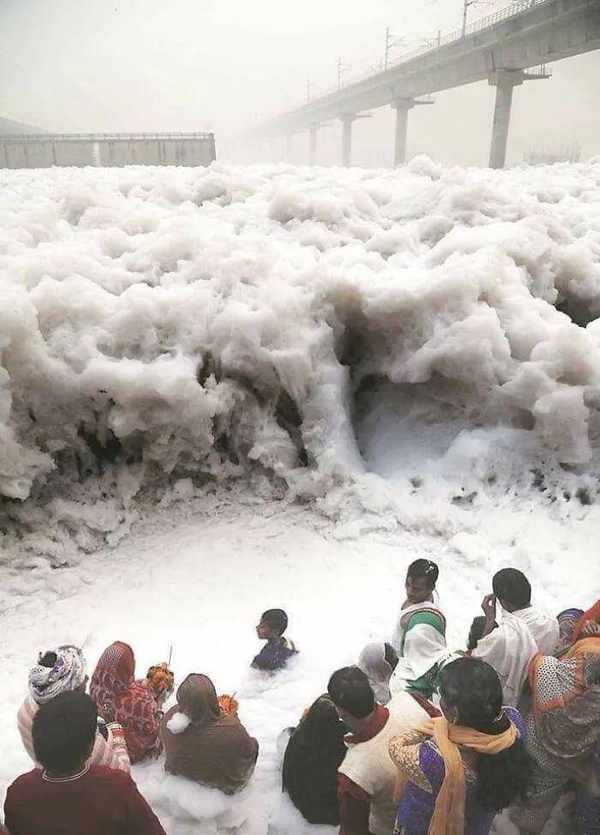 人们在印度亚穆纳河祈祷,那里正从工业废料中冒出泡沫