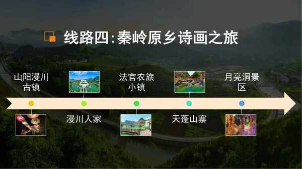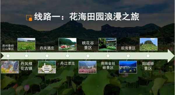 花海田园浪漫之旅。这条线路上有商州秦岭江山景区—丹凤棣花古镇—丹凤酒庄—丹江漂流—桃花谷景区—商南金丝峡景区—后湾景区—阳城驿景区。您可以在沿途尽情领略梅花、樱花、桃花、油菜花海,走进棣花古镇,做客平凹老家,品味百年红酒,激情漂流丹江,欣赏最美峡谷,观赏马战演义,体验围炉煮茶。