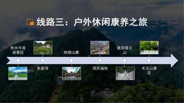 户外休闲康养之旅。这条线路上有柞水牛背梁景区—朱家湾—终南山寨—洞天福地—镇安塔云山—木王山景区。您可以漫步朱家湾,登顶牛背梁,欣赏木王山的万亩杜鹃,挑战洞天福地的魔鬼秋天,感叹塔云山的惊世奇观。