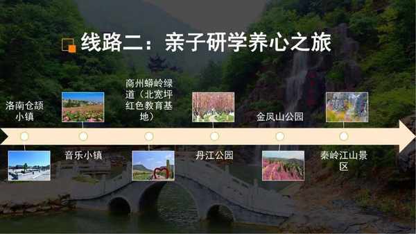 亲子研学养心之旅。这条线路上有洛南仓颉小镇—音乐小镇—商州蟒岭绿道景区—丹江公园—金凤山公园—秦岭江山景区。你可以探访汉字源头,对话先贤先烈。漫步玫瑰花海、品尝非遗美食,享受无与伦比的亲子时光。