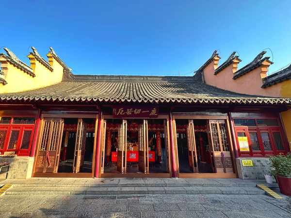清朝同治六年(1867年)建观音楼,殿内的观音背朝正门,称为倒坐观音。