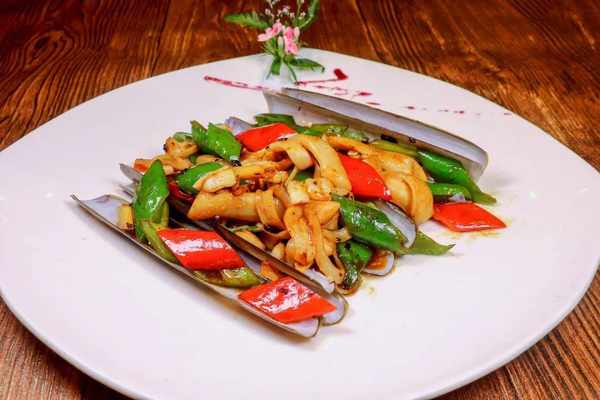 5 等蛏子全部开口后,加入尖椒炒匀,加盐、生抽调味就行了。