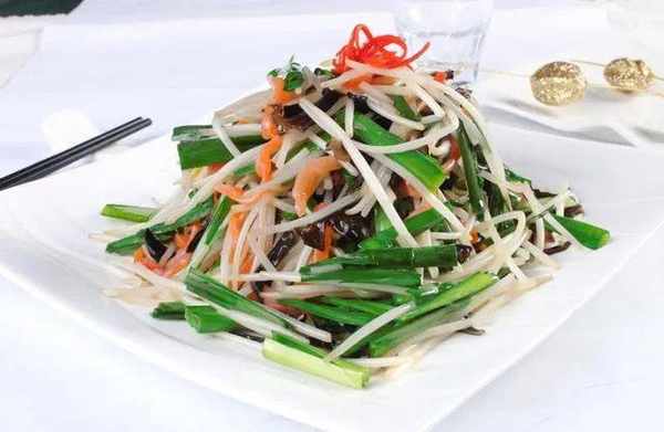 10 把炒好的银牙韭菜放入盘中。