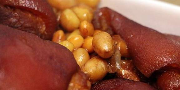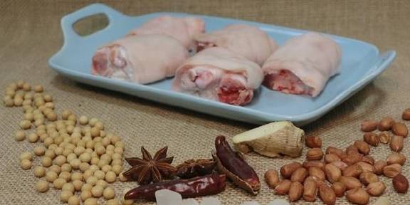 猪蹄想吃多少煮多少吧!花生一把黄豆一把姜适量八角1个干辣椒2个冰糖适量麦冬适量老抽2勺白酒2勺盐适量